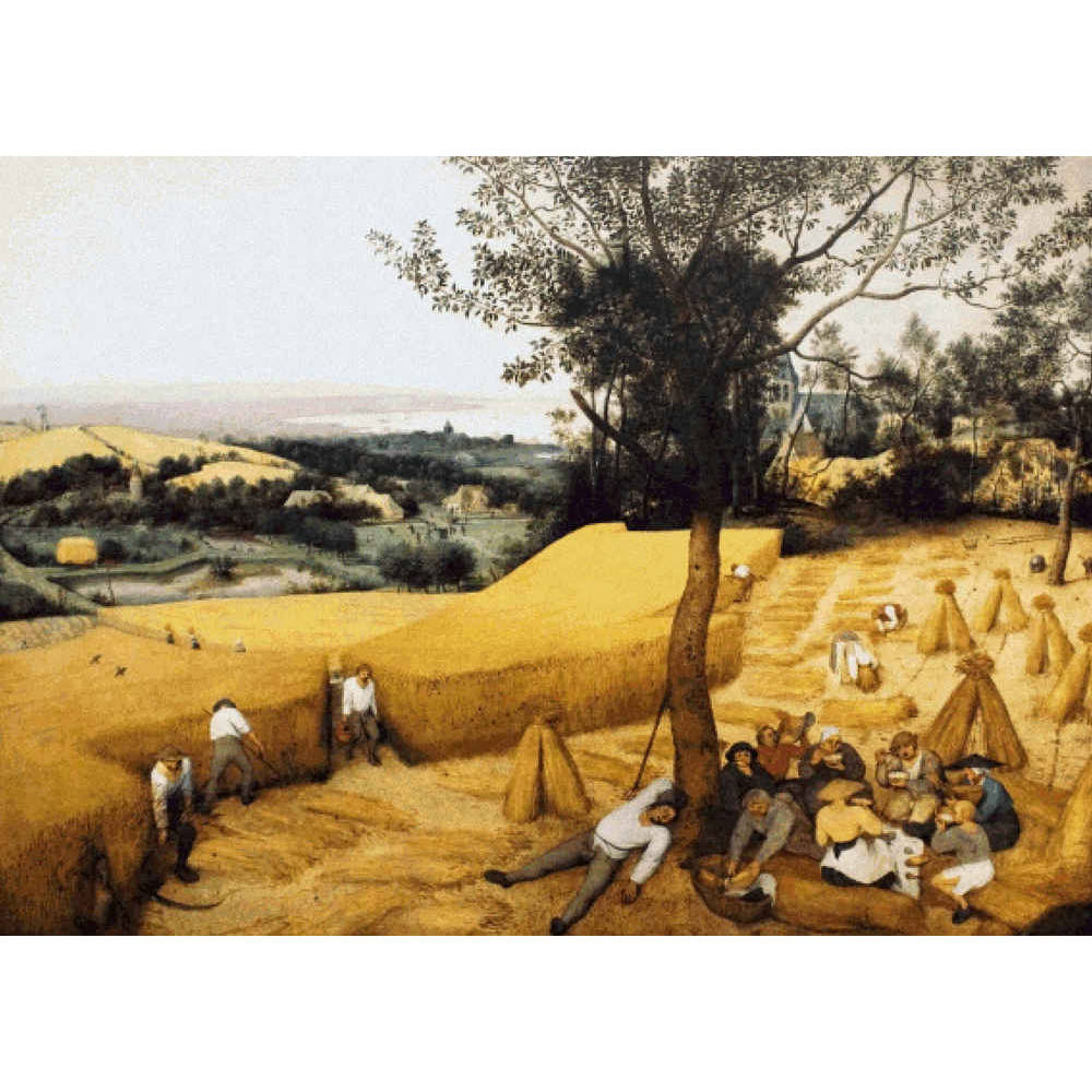 A ripe field of wheat being harvested.  In the foreground, several peasants are having lunch under a pear tree, while others continue cutting and stacking the grain.  Three women carry stacks of wheat over their shoulds as they pass along a lane in the wheat.  Their village is in the distance, and beyond it an inlet of the sea. (Northern Renaissance, 1565) This pattern is solidly stitched. Any color fabric may be used.