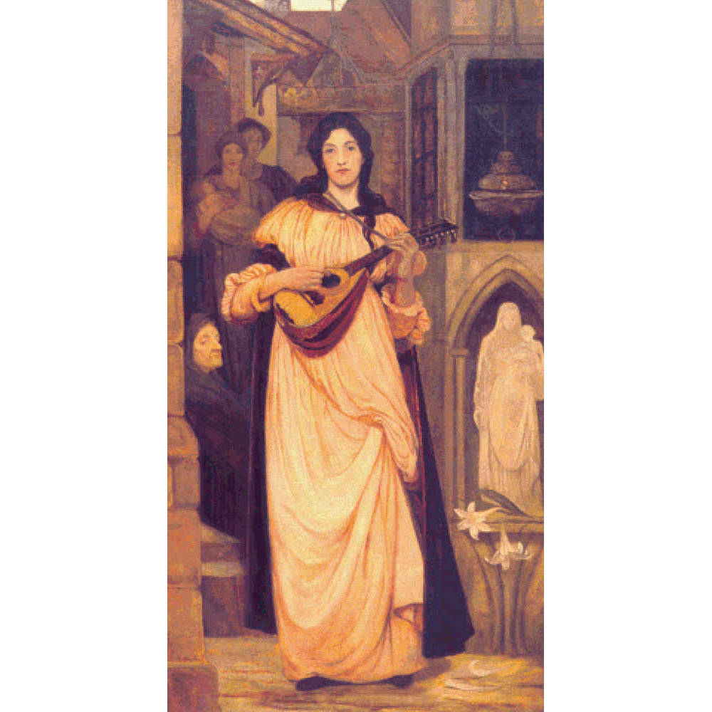 Through the narrow streets of a medieval town the glee-maiden pursues her way, touching her mandolin as she goes, self-absorbed and heedless of the gossiping remarks and the wondering glances of those who have clustered at their doors to see her pass.” [Description by artist] (Pre-Raphaelite, 1890) This pattern is solidly stitched. Any color fabric may be used.