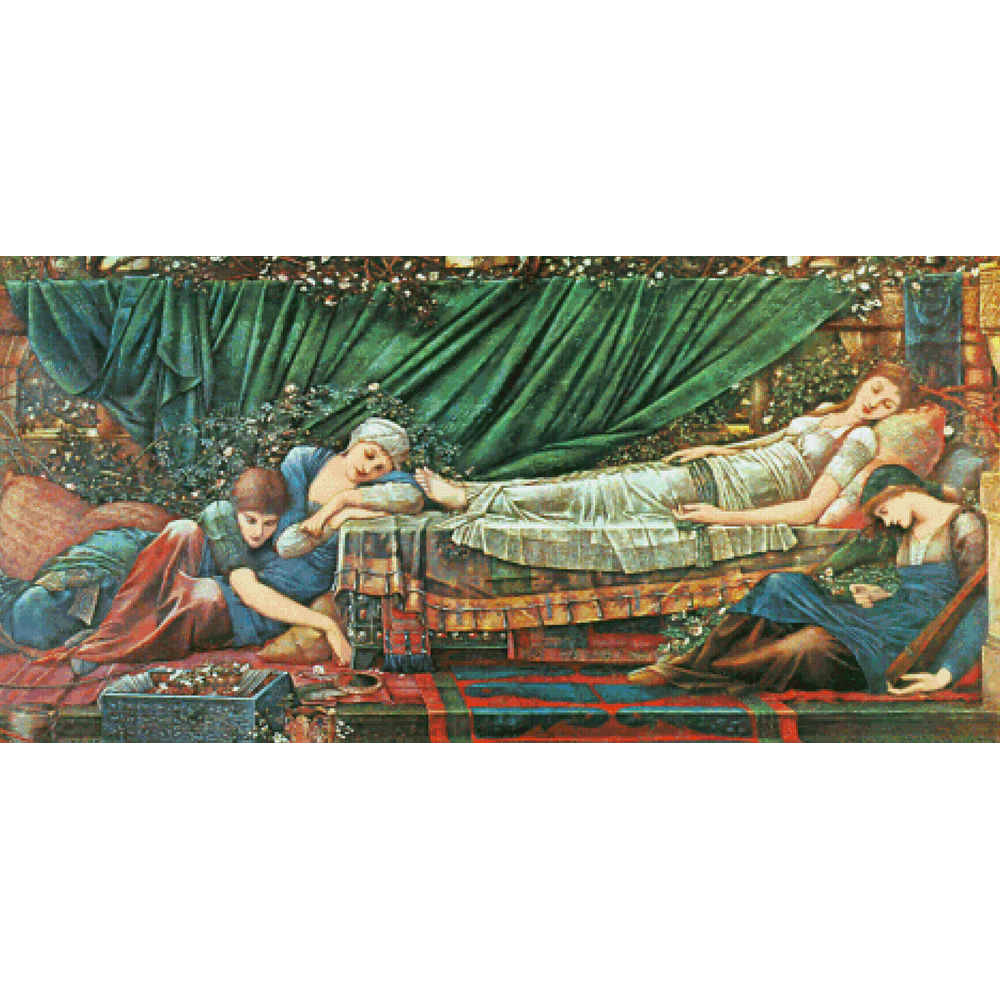 M Burne-Jones’ cycle of paintings “The Legend of Briar Rose” (the Sleeping Beauty).  Here, the Sleeping Beauty, having pricked her finger on a spindle and been cast into a deep sleep, lies in her bower on a richly draped couch with her ladies-in-waiting asleep just where they were when the spell was cast, one still reaching toward a mirror and coffer of jewels.  Over time, thorny rose brambles have grown through the castle windows and are draping the curtain behind the couch.  “Here lies the hoarded love the key/ To All the treasure that shall be/ Come fated heart the gift to take/ And smite the sleeping world awake.” – William Morris. (Pre-Raphaelite, 1890) This pattern is solidly stitched. Any color fabric may be used.