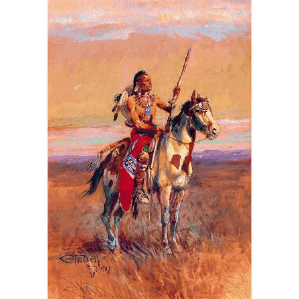 A Plains Indian scout seated on his pinto horse on the prairie at dawn.  A glorious sunrise and ridge of purple mountains are behind him.  He has a rifle in one hand as he gazes into the distance.  He wears a bearclaw necklace, a hide shield decorated with eagle feathers, leather leggings, and a fancy red blanket. (1907) This pattern is solidly stitched. Any color fabric may be used.