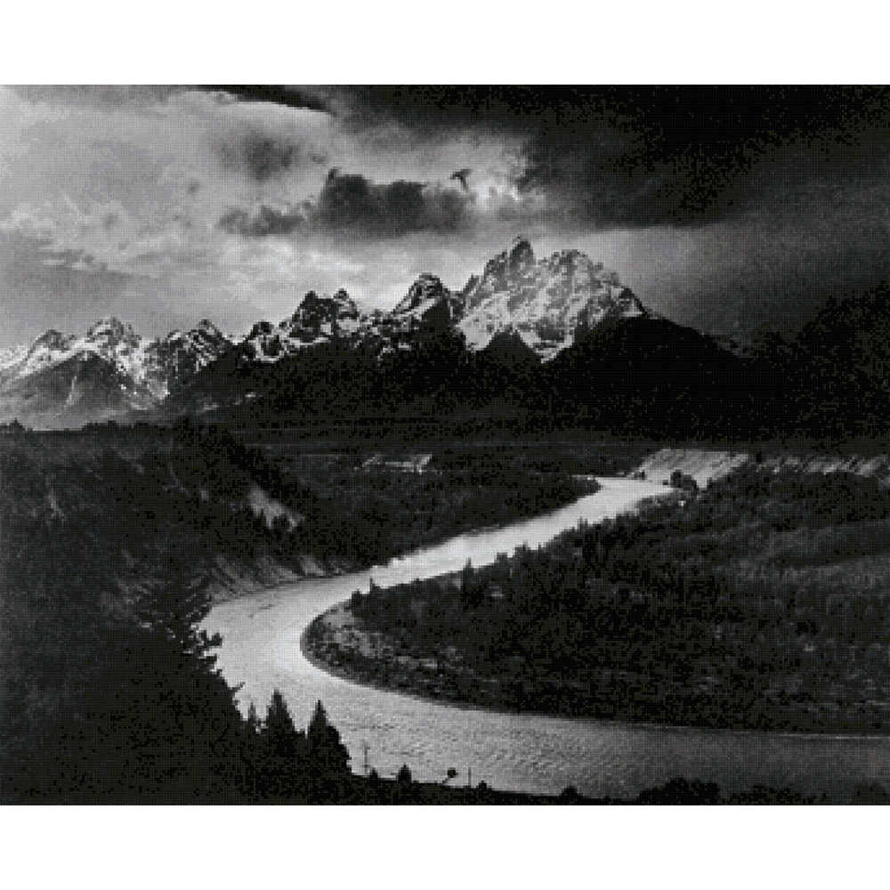 The Snake River, gleaming the the foreground, winding its way before the snow-covered Grand Teton Mountains in Grand Teton National Park in Wyoming.  Dark moody clouds are moving in on the right side of the picture. (1942) This pattern is solidly stitched. Any color fabric may be used.