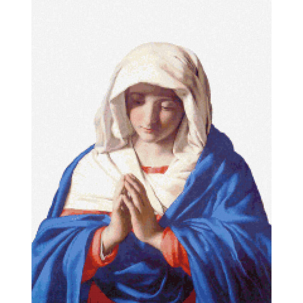 A very gentle and sweet-faced Virgin Mary at prayer wearing red and blue against a plain white background.  The background is not stitched; use white fabric.  The original painting has a black background; see SAS001 for a version to be stitched on black fabric.  (1640-50)