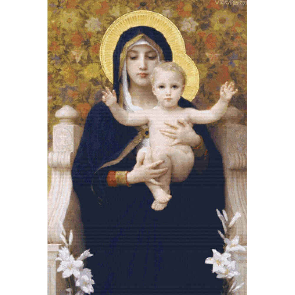 A cool and serene Virgin Mary wearing a navy blue robe with a gold border, with a formal gold halo behind her head.  She is seated on a carved ivory throne holding the baby Jesus, with Easter lilies at her feet.  The background is gold with many flowers. (Academic, 1899) This pattern is solidly stitched. Any color fabric may be used.