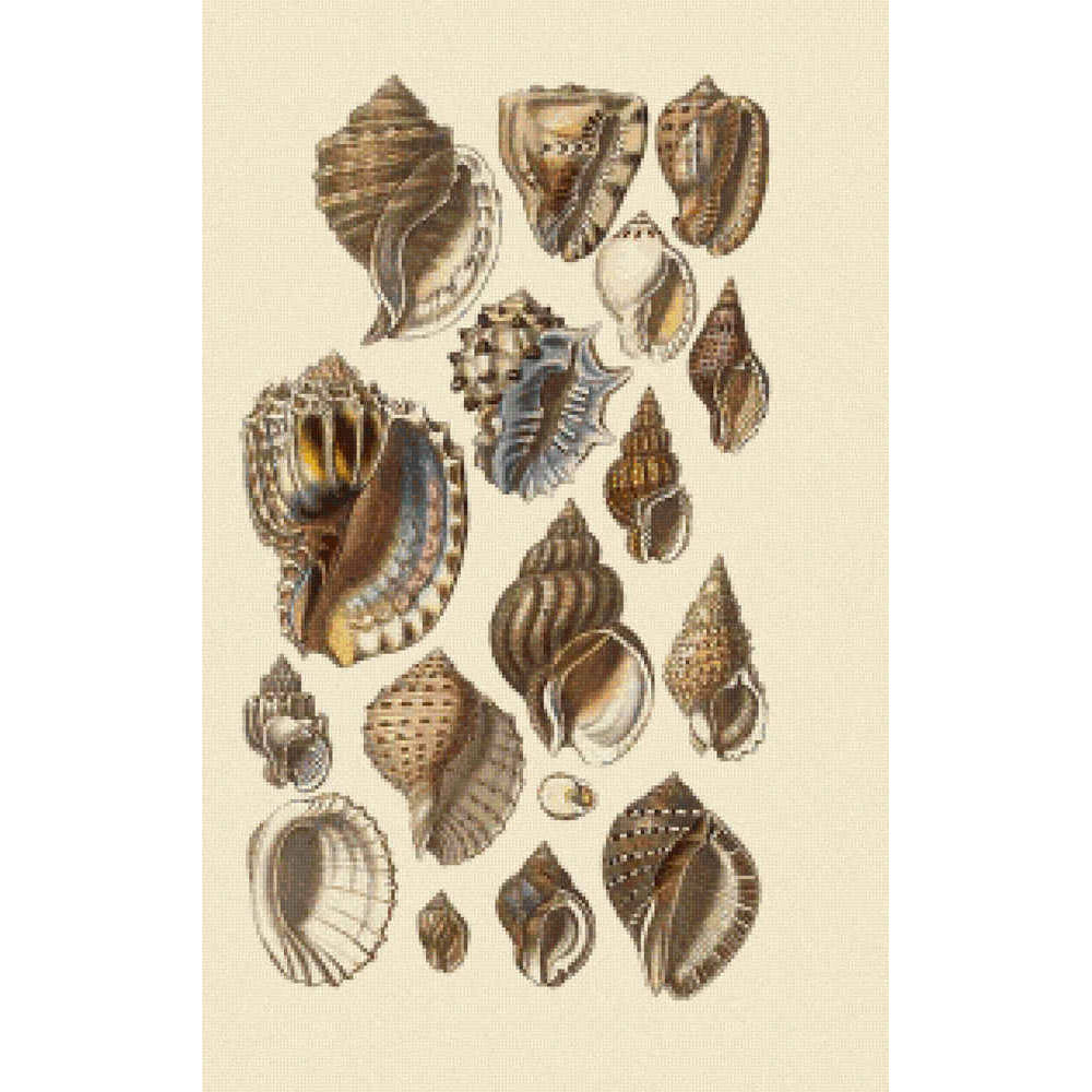 A print of various tropical sea shells. The background is not stitched.  Use ecru fabric.