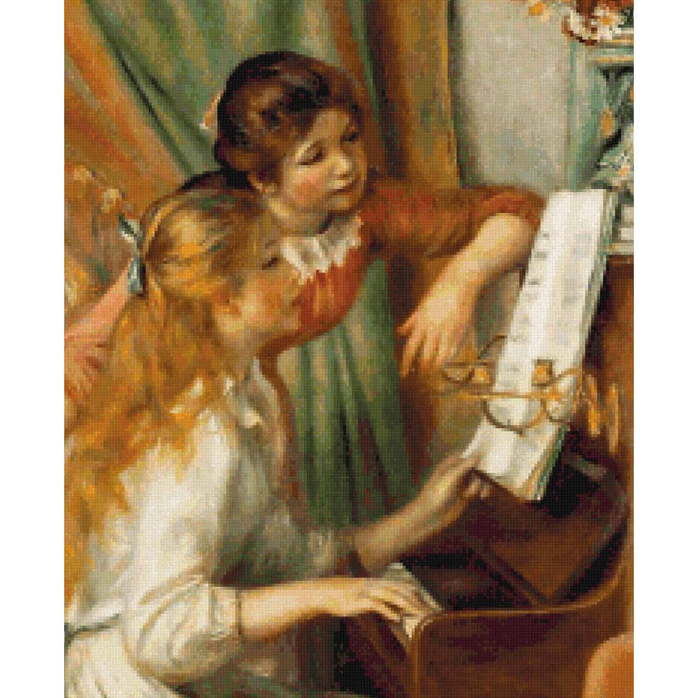 A young girl in a white dress with blue sash and blue hair ribbon picks out a tune on the piano.  Her dark-haired friend in an orange dress leans on the chair and piano as she follows the music.  The room is decorated in orange and green.  This detail of the full picture focusses on the two girls. We also offer the full picture. (Impressionist, 1892) This pattern is solidly stitched. Any color fabric may be used.