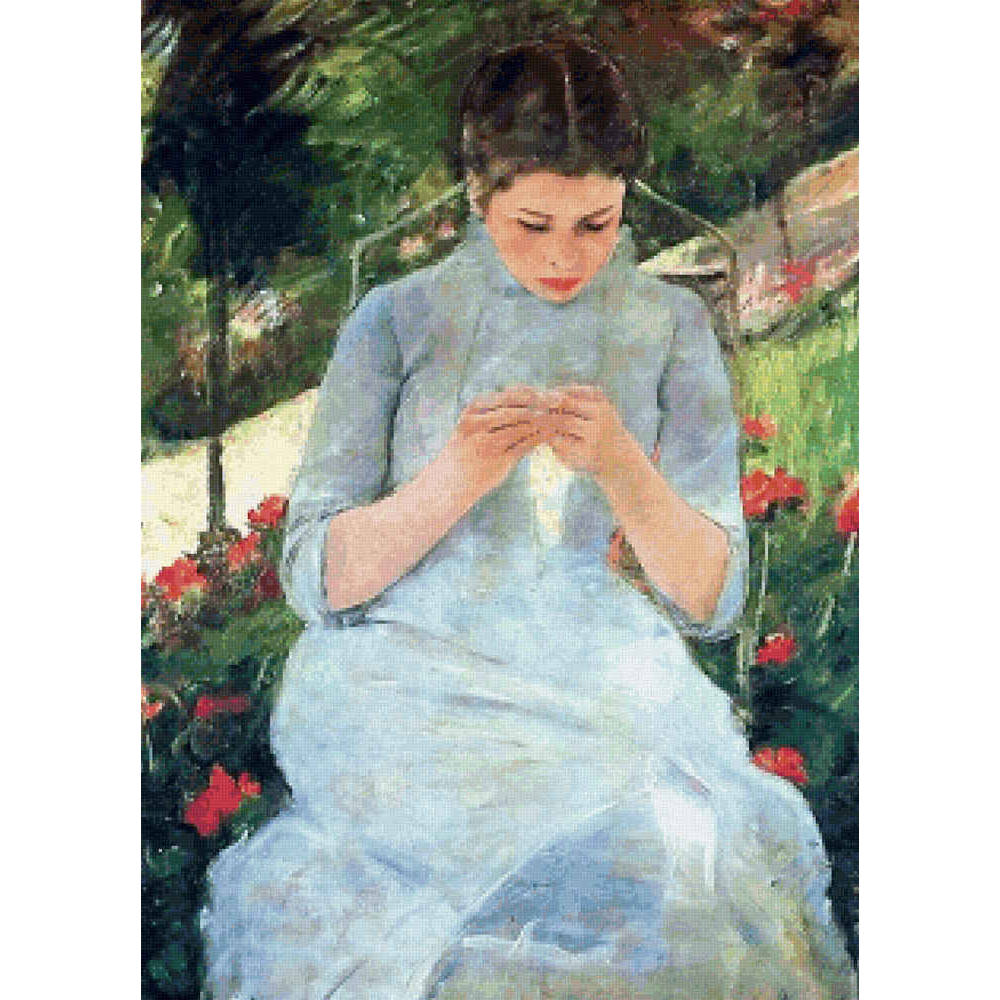 A beautiful young women wearing a light blue dress concentrating on a dainty bit of sewing.  She is seated in an iron garden chair in front of a bed of geraniums.  Behind her is a steep path with dense trees and vegetation beyond. (Impressionist, 1880-2) This pattern is solidly stitched. Any color fabric may be used.